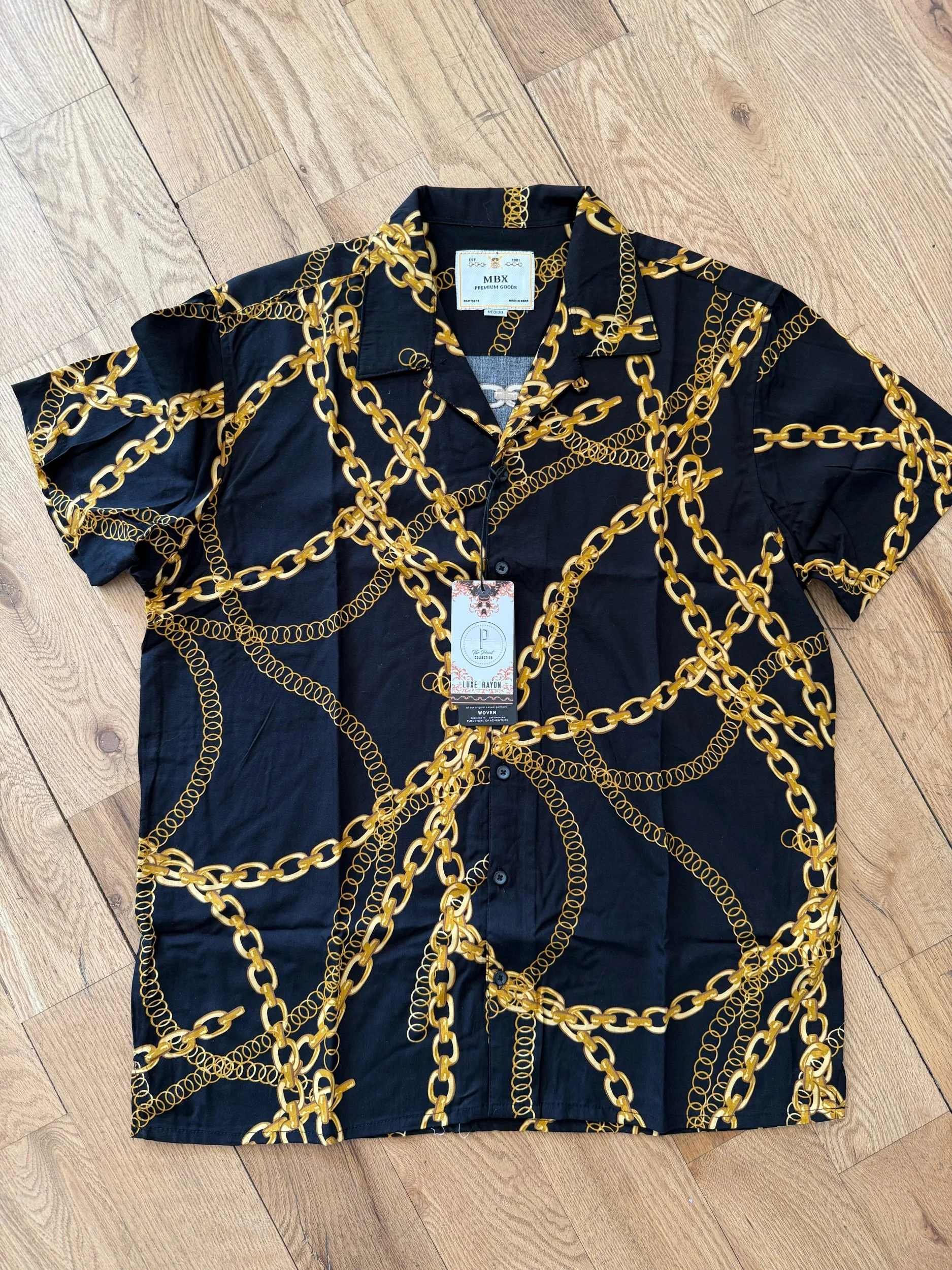 Shop › Chain Link Button Up Blk Gld Image 1 of 1 Chain Link Button Up Blk Gld $34.99 100% viscose, premium feel button up, standard fit. Size: Small Medium Large XL Add To Cart Added! 100% viscose, premium feel button up, standard fit.