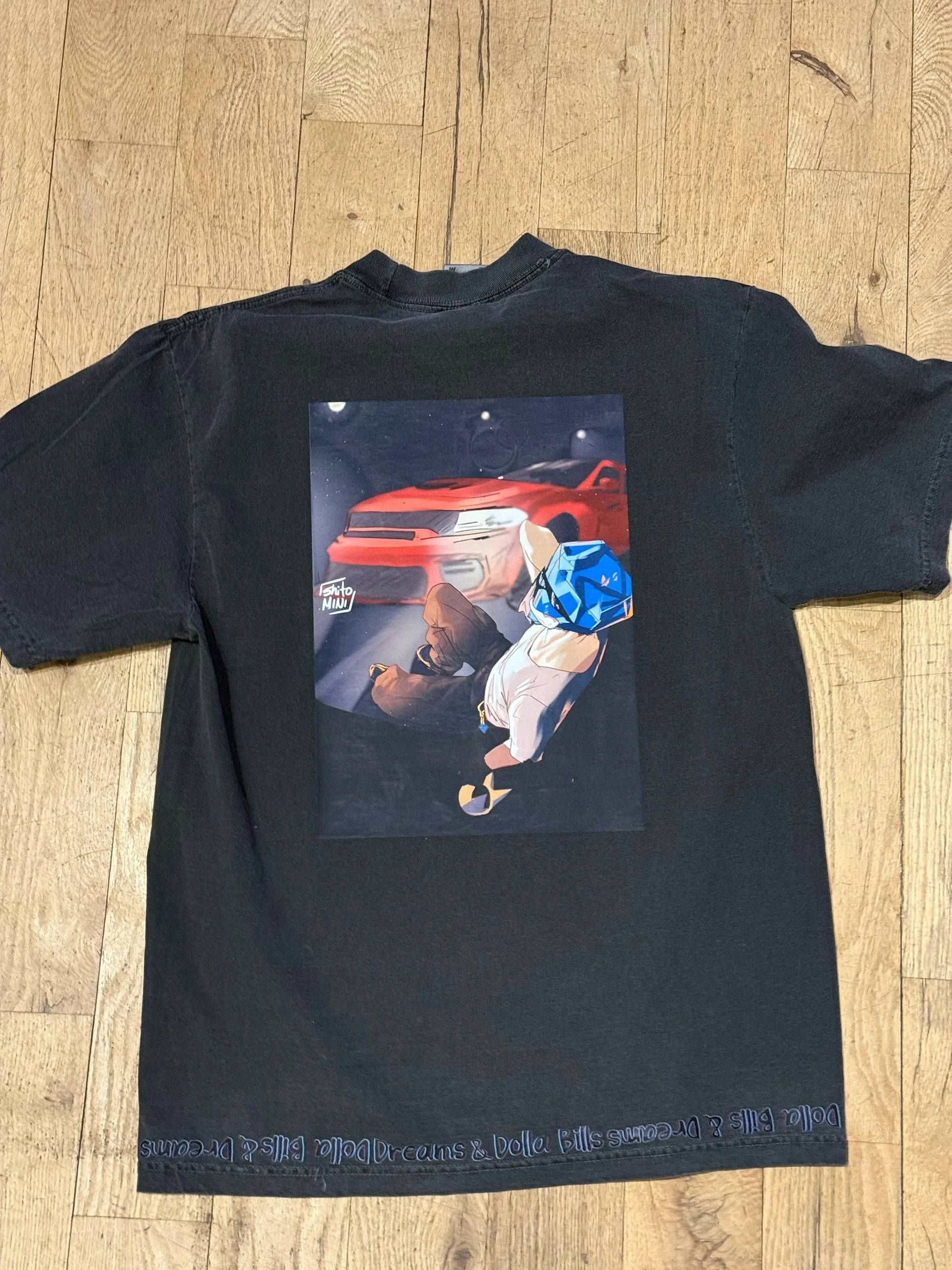 Printed on a Shaka Super heavy weight, baggy fit, 100% cotton, “Dreams & Dolla Bills” printed along bottom of shirt front and back.